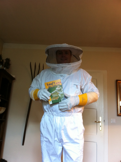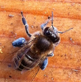 Eine Honigbiene mit blauen Pollenhöschen.